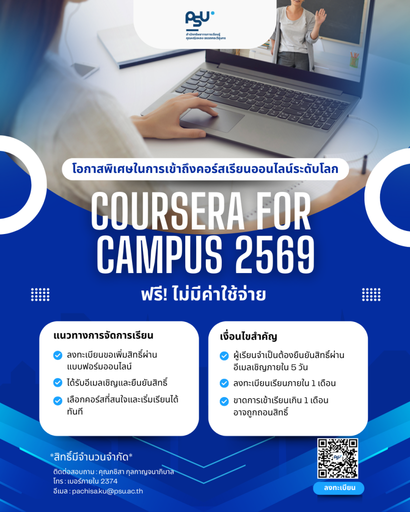 มหาวิทยาลัยสงขลานครินทร์ เปิดโอกาสให้คณาจารย์ นักศึกษา และบุคลากร เข้าร่วมโครงการ Coursera for Campus 2569 เพื่อส่งเสริมการเรียนรู้ตลอดชีวิต