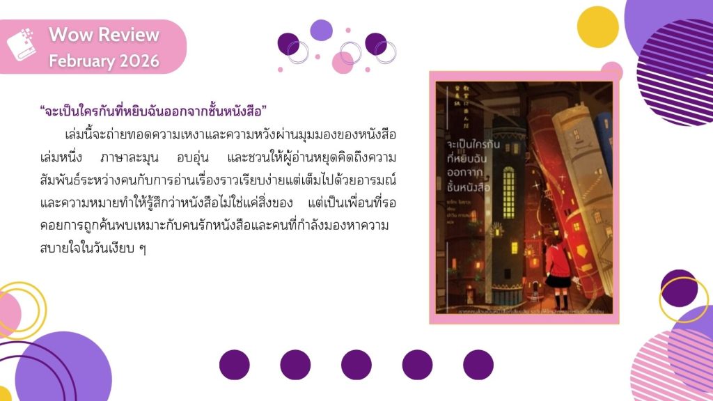 หนังสือนวนิยาย ชั้น 4 เลขเรียกหนังสือ น อ92จ 2565 Click ต้องการยืมตัวเล่ม Book Delivery Service Click รายชื่อหนังสือแนะนำเดือนนี้ Click